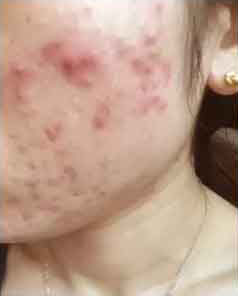 小婷到店治疗的时候,脸部痘痘比较严重,脸颊布满大量丘疹和脓包型痘痘,还有几处已经形成结节,发炎严重,脸上还残留了部分红褐色痘印。造成痘痘如此严重跟患者本身的油性皮肤有很大关系,而且患者还经常浓妆,并且卸妆不彻底这也是形成痘痘的一个重要因素。