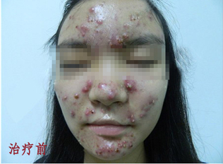从照片上看可以看出来,沈小姐的痘痘颗粒很大,一颗颗囊肿边界分明而且发红严重有的还有脓包的情况,分布的也比较分散造成整张脸部多处囊肿。针对这种情况,SOR祛痘的皮肤医生给沈小姐开了一个排毒疗程和一个祛痘疗程。治疗的时候通过清洁肌肤,热喷仪打开毛孔,吸取毛孔里面的垃圾,然后在敷上收缩毛孔的面膜,平复肌肤。这样的排毒加祛痘双管齐下把痘痘彻底消灭。>>>具体治疗方案请咨询在线祛痘专家